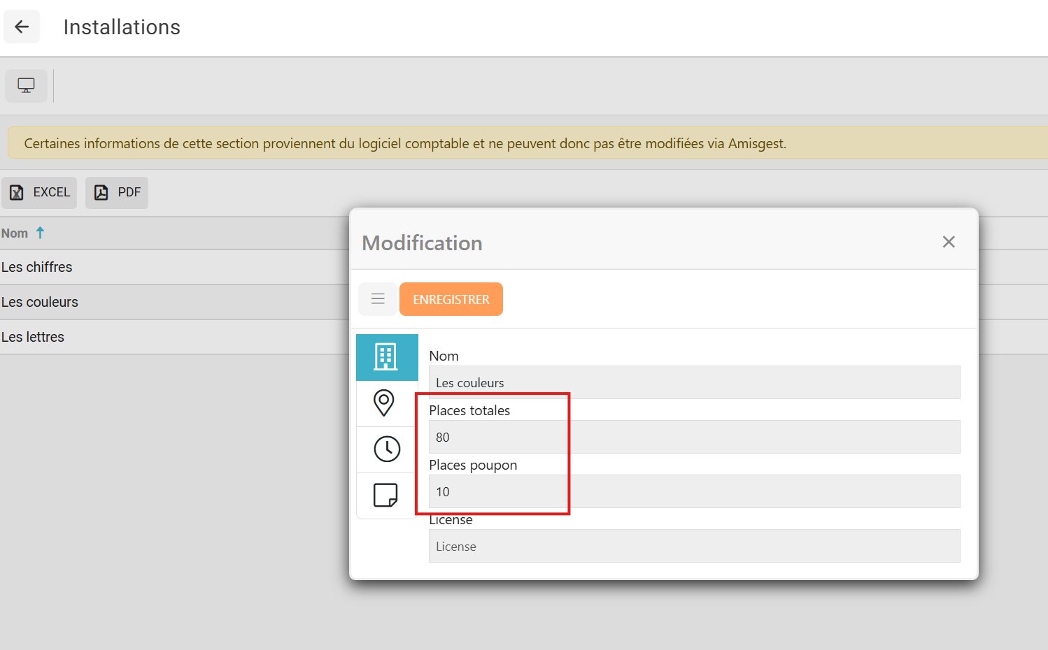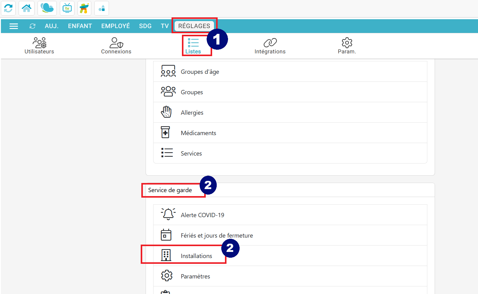 Or, pour que le système puisse faire le calcul il est important que votre nombre total de places soit inscrit dans votre Amisgest SDG+, dans l'onglet "Réglages-Listes(1)", Puis dans l'encadré "Service de garde-Installations(2)".